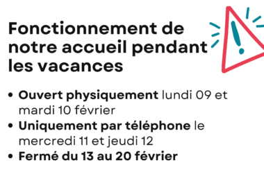 Vacances d’hiver – Information accueil Merci de noter le fonctionnement de notre accueil pendant les deux prochaines semaines : Ouvert physiquement• Lundi 9 et mardi 10 février Accueil téléphonique uniquement• […]