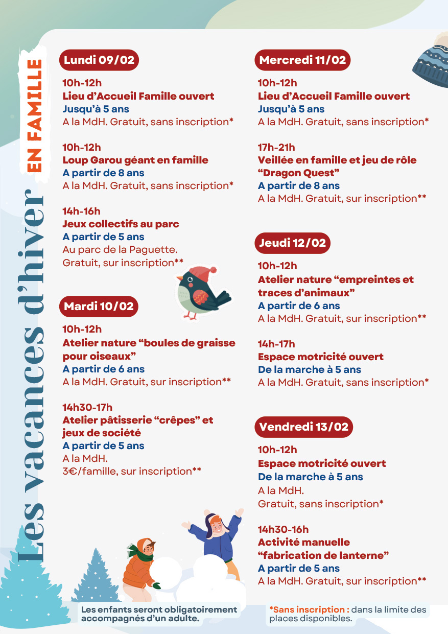 – Jeux collectifs au parc, de 14h à 16h au parc de la Paguette, à partir de 5 ans. Adhésion nécessaire, gratuit, sur inscription. - Mercredi 11 février : Veillée en famille et jeu de rôle « Dragon Quest » à la MdH de 17h à 21h, à partir de 8 ans. Adhésion nécessaire, gratuit, sur inscription.