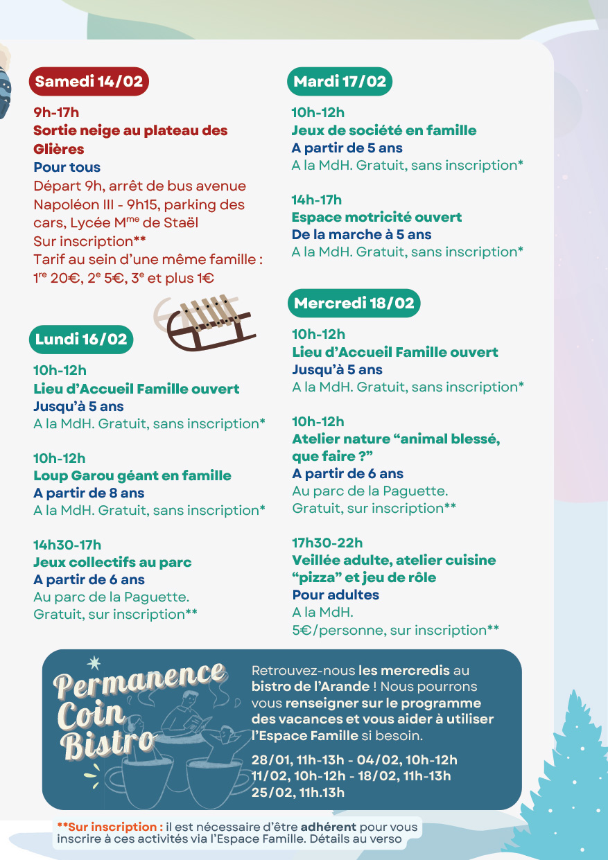 - Mercredi 18 février : veillée adulte, atelier cuisine « pizza » et jeu de rôle, à la MdH de 17h30 à 22h. Adhésion nécessaire, 5€/personne, sur inscription.