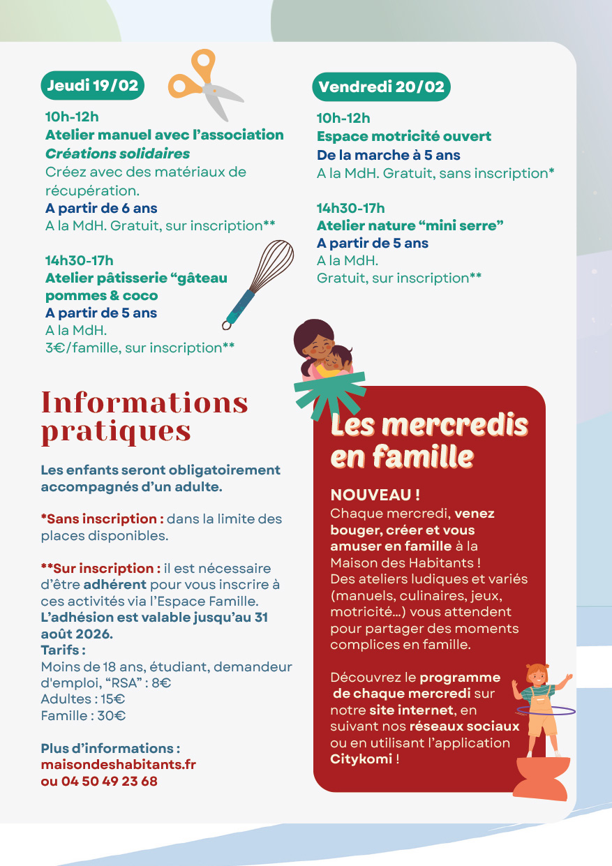 – Atelier pâtisserie « gâteaux aux pommes et coco » & jeux de société à la MdH de 14h30 à 17h, à partir de 5 ans. Adhésion nécessaire, 3€/famille, sur inscription. - Vendredi 20 février : atelier nature « mini serre » à la MdH de 14h30 à 17h, à partir de 5 ans. Adhésion nécessaire, gratuit, sur inscription.